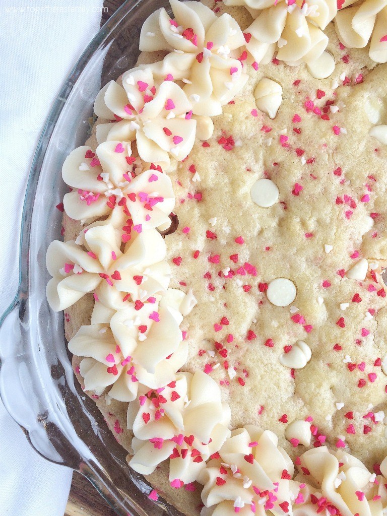 Celebrate Valentine's Day with this ultra soft & delicious funfetti sugar cookie cake that's filled with festive red and pink sprinkles, and white chocolate chips! Topped with a vanilla almond frosting and extra sprinkles for garnish. Perfect for Valentine's Day dessert for those you love.